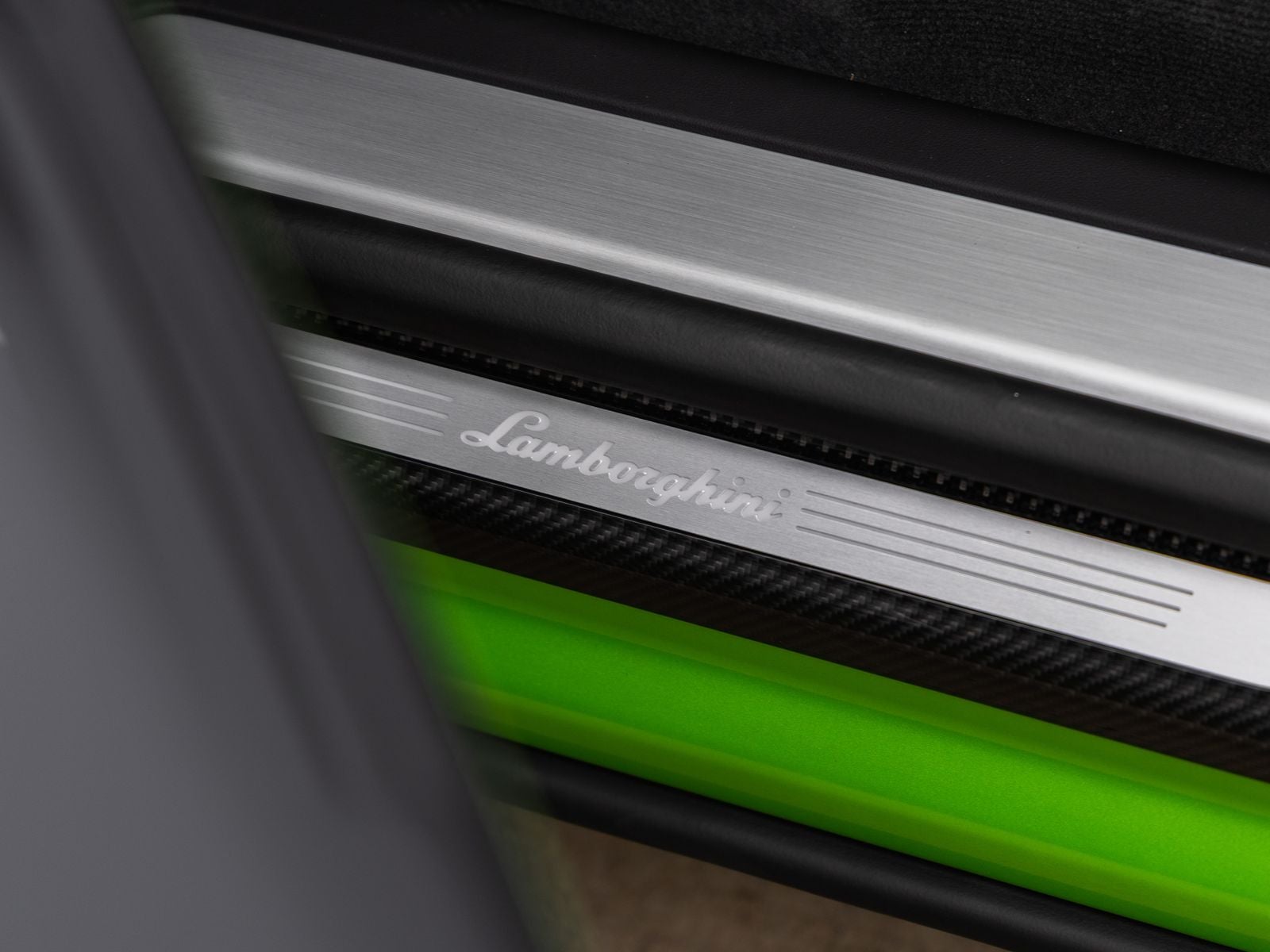 Carbon Fiber Kick Plates with Embroidered Lamborghini Shield: Exclusive interior detailing that reinforces Lamborghini craftsmanship.