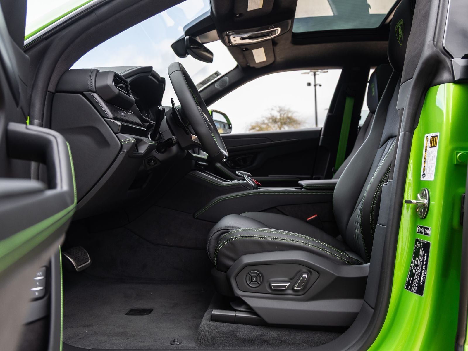 Step inside and the Nero Ade leather interior greets you, delivering a refined blend of luxury and sport. Unicolor Leather Interior appointments and Full Electric Front Seats provide exceptional comfort and adjustability, while Ambient Lighting creates a sophisticated cabin atmosphere. Carbon Fiber Kick Plates, Embroidered Lamborghini Shield headrests, and Open Pore Wood Inserts with Black Anodized Treatment add distinctive craftsmanship throughout the interior. The Advanced 3D Bang & Olufsen Sound System completes the cabin with an immersive premium audio experience.