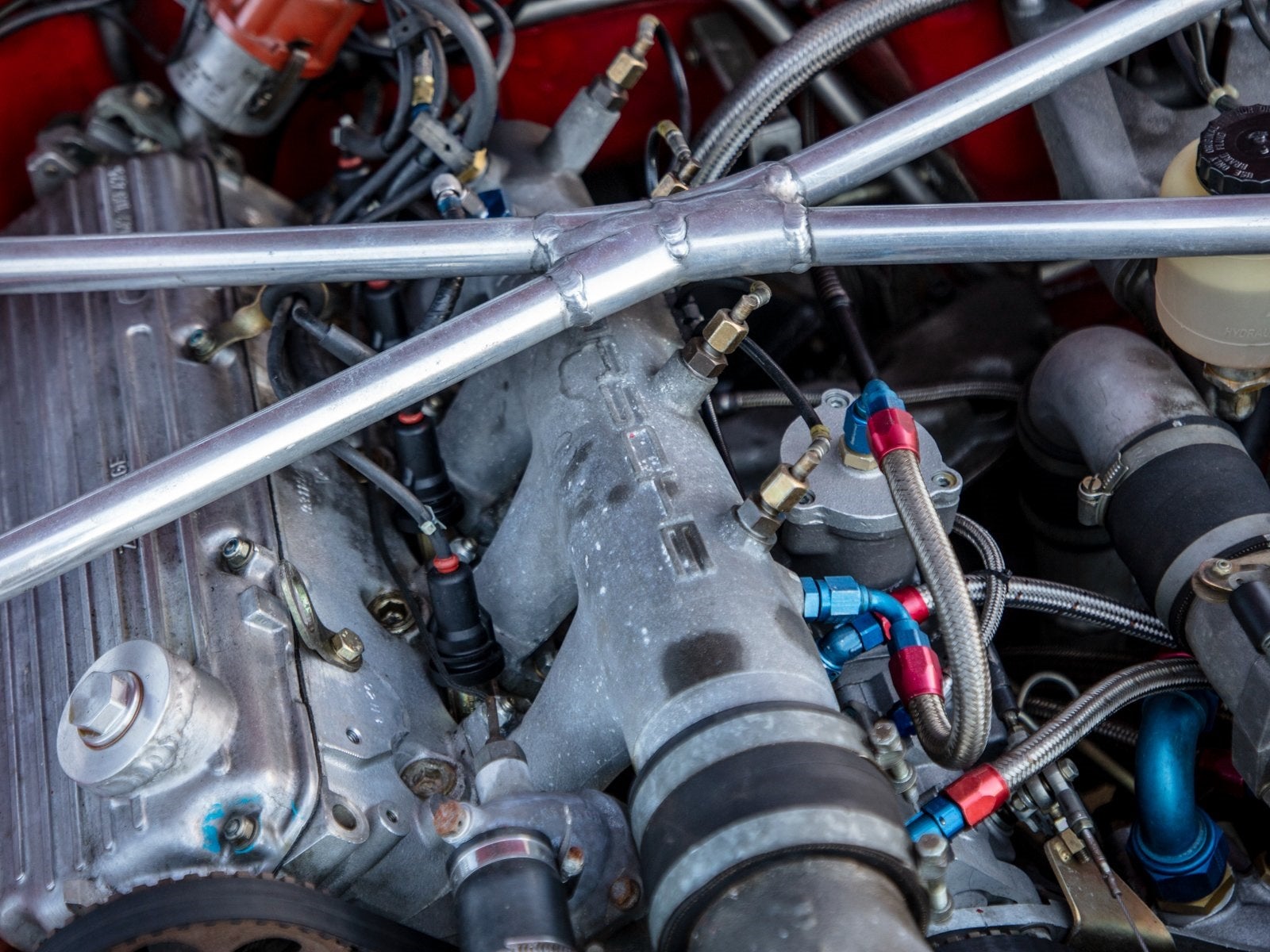 In 1979, Porsche began developing its 924 Turbo as a Group 4 GT entry for the 1980 24 Hours of Le Mans. The new coupe was fitted with a full alloy roll cage and an additional cross-brace beneath the hood. Body panels included aluminum, lightweight urethane and fiberglass. Disc brakes and axles came from the 935 parts bin; a larger intercooler was fitted in the nose; an uprated dog-leg five-speed transmission with limited-slip and its own cooler mounted at the rear gave the chassis exceptional balance. The suspension was fully adjustable, with titanium springs and Bilstein coil-overs front and rear. The dry-sump 2.0-liter inline four developed a startling 375 horsepower with almost 300 pound-feet of torque, giving the 2,050-pound GTR brilliant a 180-mph top speed.