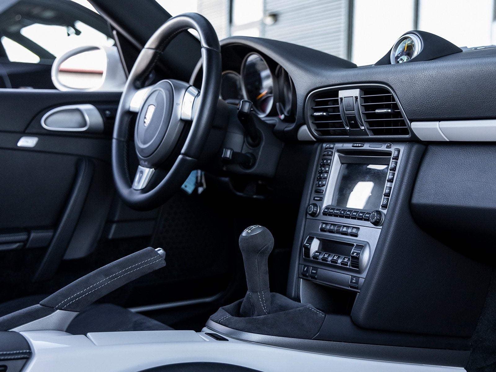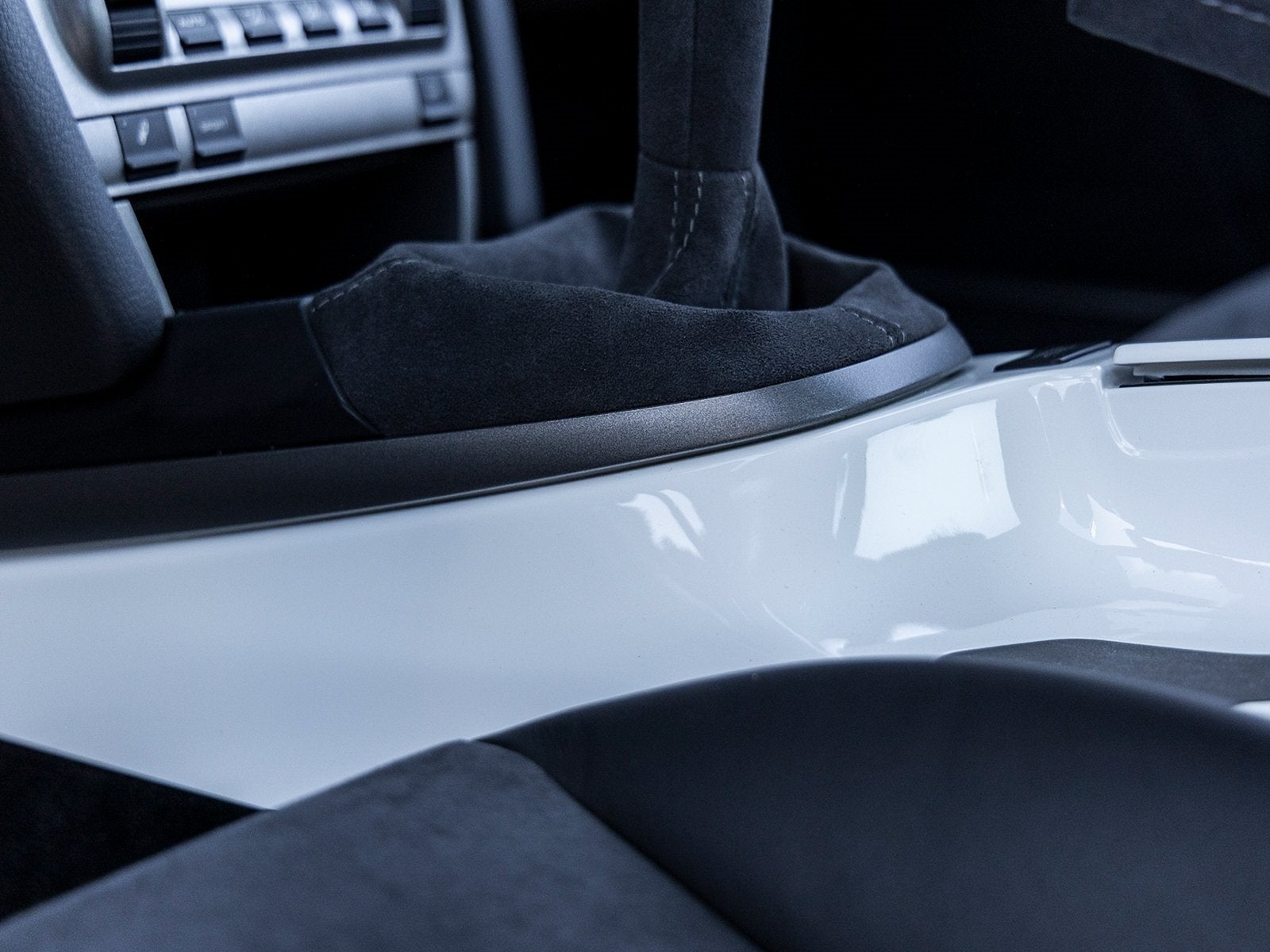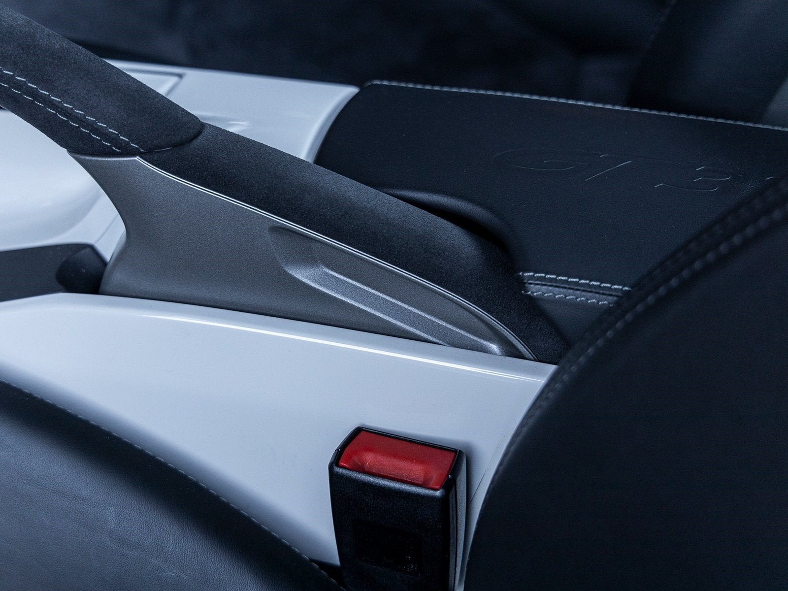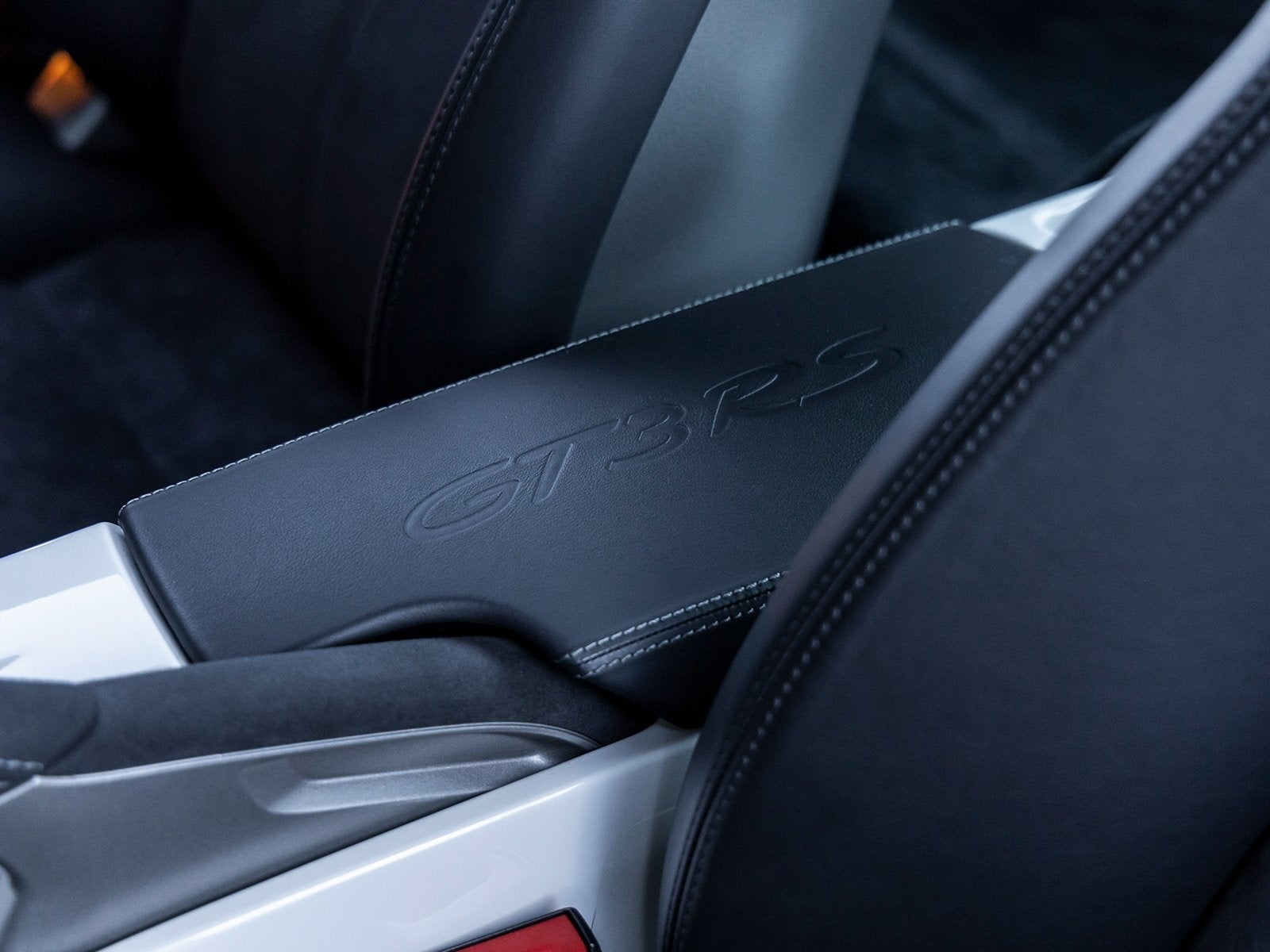 The GT3 RS stands as a beacon of design and performance, its Carrara White exterior not just a color, but a badge of honor that reflects Porsche's illustrious racing heritage. Adorned with 19 GT3 RS Wheels in a Deviating Color and Bi-Xenon Headlights, it presents an intimidating stance. Standard Rocker Panels and Rear Center Console painted in the cars color, along with Side Stripes with GT3 RS logo in a contrasting hue, enhance its aggressive allure.