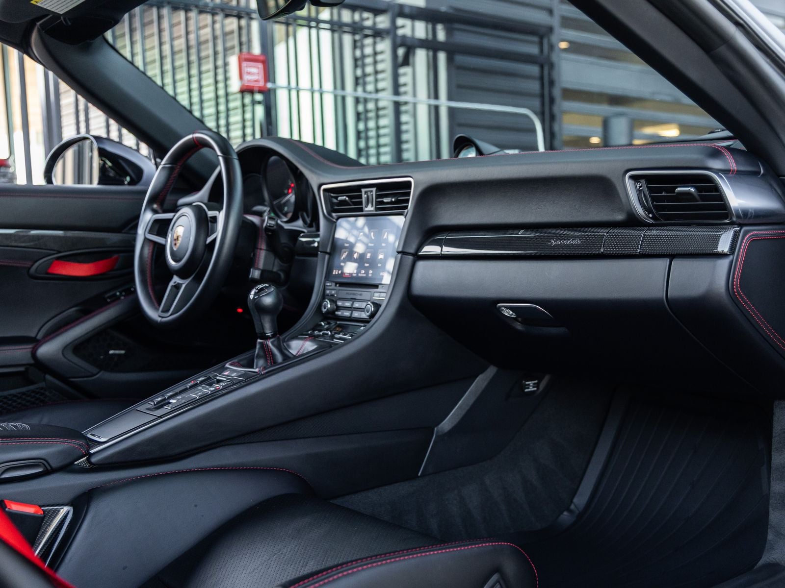 Step inside and the Leather Interior in Black with Red Stitching greets you with purposeful luxury. The Steering Wheel with 12 OClock Marker in Red and Seat Belts in Guards Red add a racing-inspired touch. Premium craftsmanship is evident through the Leather Dashboard Trim Package, Leather Door Panel Trim, Leather Sun Visors, and Steering Column Casing in Leather, while Illuminated Carbon Fiber Door-Sill Guards provide an elegant finishing detail.