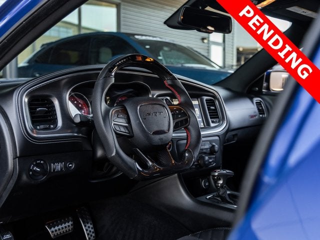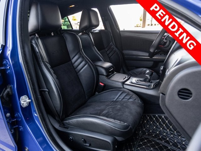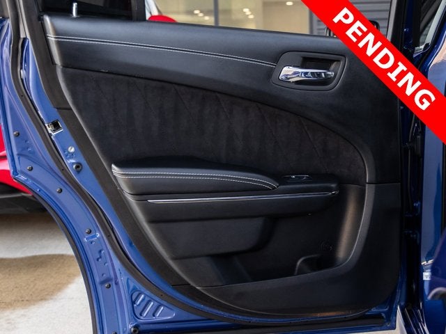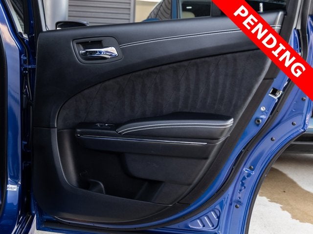 The Charger SRT Hellcat Widebody commands attention with its aggressive stance and unmistakable presence. The Indigo Blue exterior is complemented by the factory Widebody Competition Suspension, 20-inch x 11.0-inch Carbon Black Aluminum Wheels, and SRT Performance Spoiler, giving this sedan both track-ready capability and street-dominating style. Bi-Function HID Projector Headlamps, LED Daytime Running Lamps, and SRT Hellcat Exterior Badges further emphasize its high-performance pedigree, while the Gloss Black Painted Roof adds a menacing finishing touch.