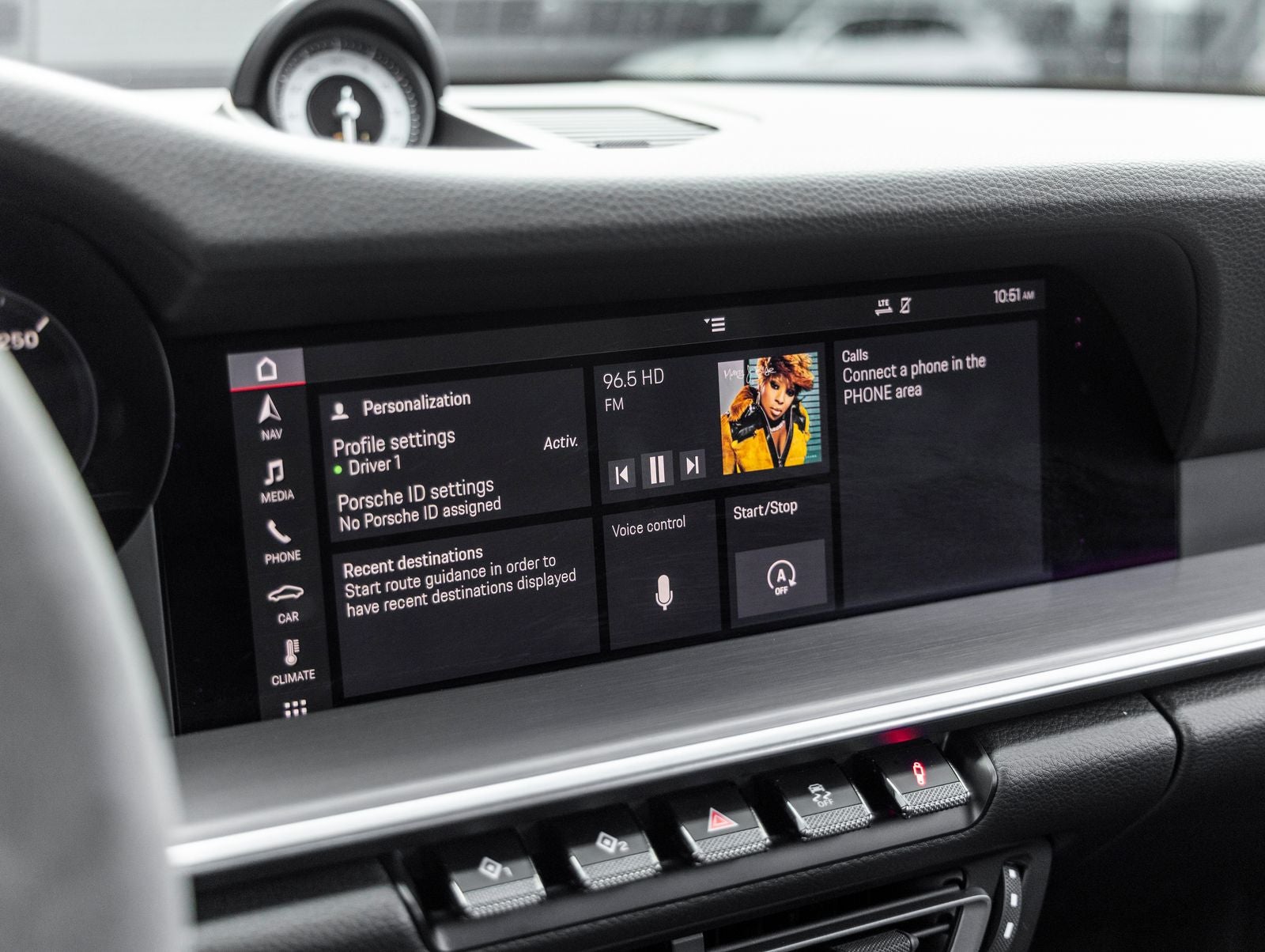 - Radio: Porsche Communication Management (PCM) -inc: Porsche Connect Plus (online navigation, Apple CarPlay, SiriusXM, 4G/LTE telephone module and wireless internet access), Porsche Car Connect (car finder, remote vehicle status, remote services and Porsche Vehicle Tracking System (PVTS)), sound package plus analog sound system, 8 loudspeakers, 150-watt total output w/integral amplifier and digital signal processing, Subscription required for Porsche Car Connect