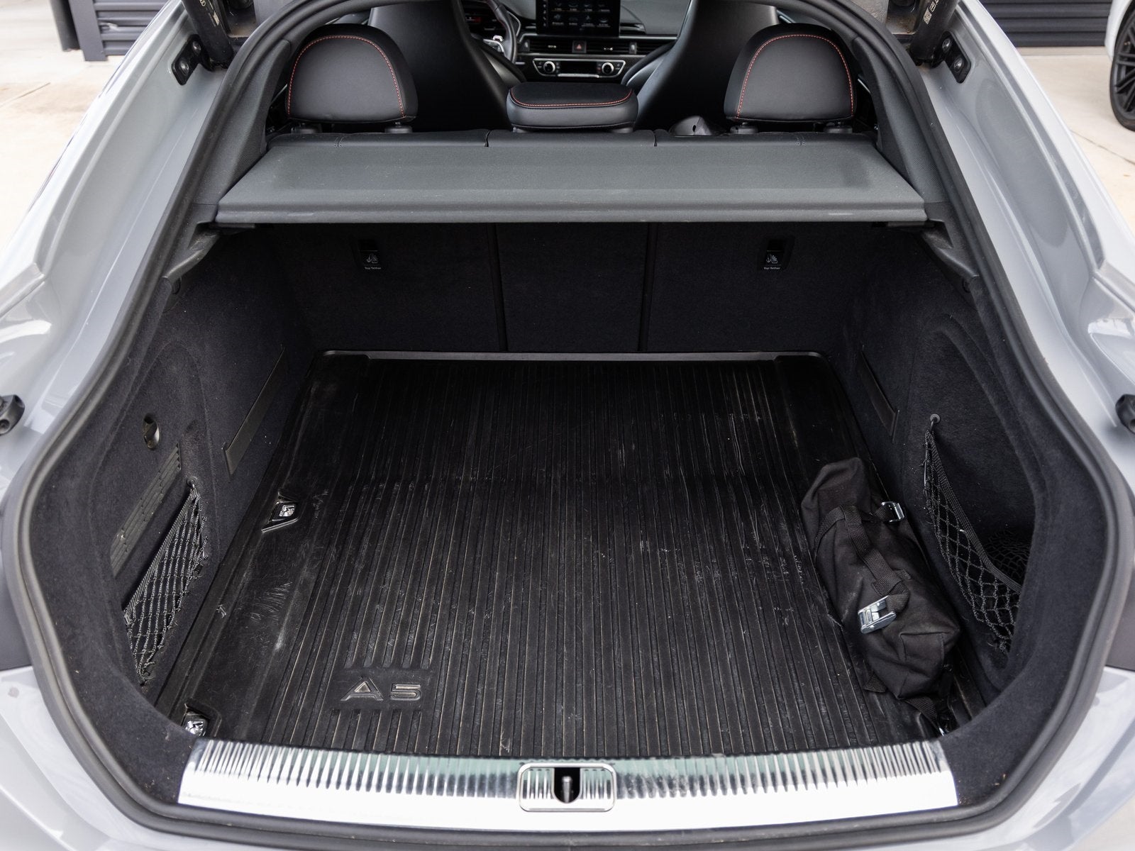 The RS 5 commands attention with its bold Nardo Grey exterior, a signature Audi Sport color that highlights its muscular stance and aerodynamic design. Carbon Fiber accents elevate its presence, including a Carbon Fiber Front Bumper Lip, Carbon Fiber Rear Bumper Lip, Carbon Fiber Rear Lip Spoiler, and Carbon Fiber Door Mirrors. Red Brake Calipers provide a vivid contrast behind the wheels, underscoring the RS 5s high-performance braking capability and motorsport-inspired character.