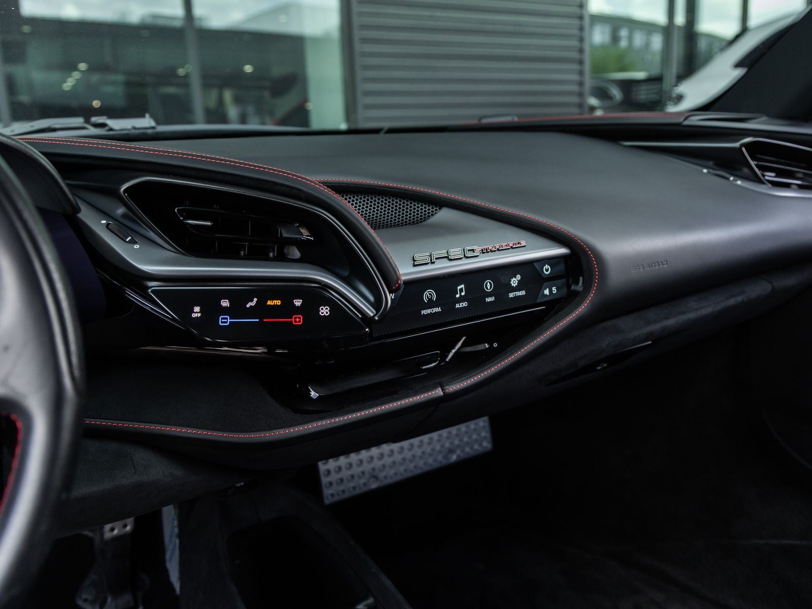 The SF90 Stradale stands as a revolutionary benchmark in Ferraris lineup, its Rosso Scuderia exterior not just a color, but a statement of innovation and racing pedigree. Enhanced by Yellow Brake Calipers, Carbon Fibre Driver Zone + LEDs, and striking 20 Forged Diamond Wheels, it presents an aggressive and futuristic stance. Black Tailpipe Tips and Scuderia Ferrari Shields further emphasize its unmistakable supercar identity.