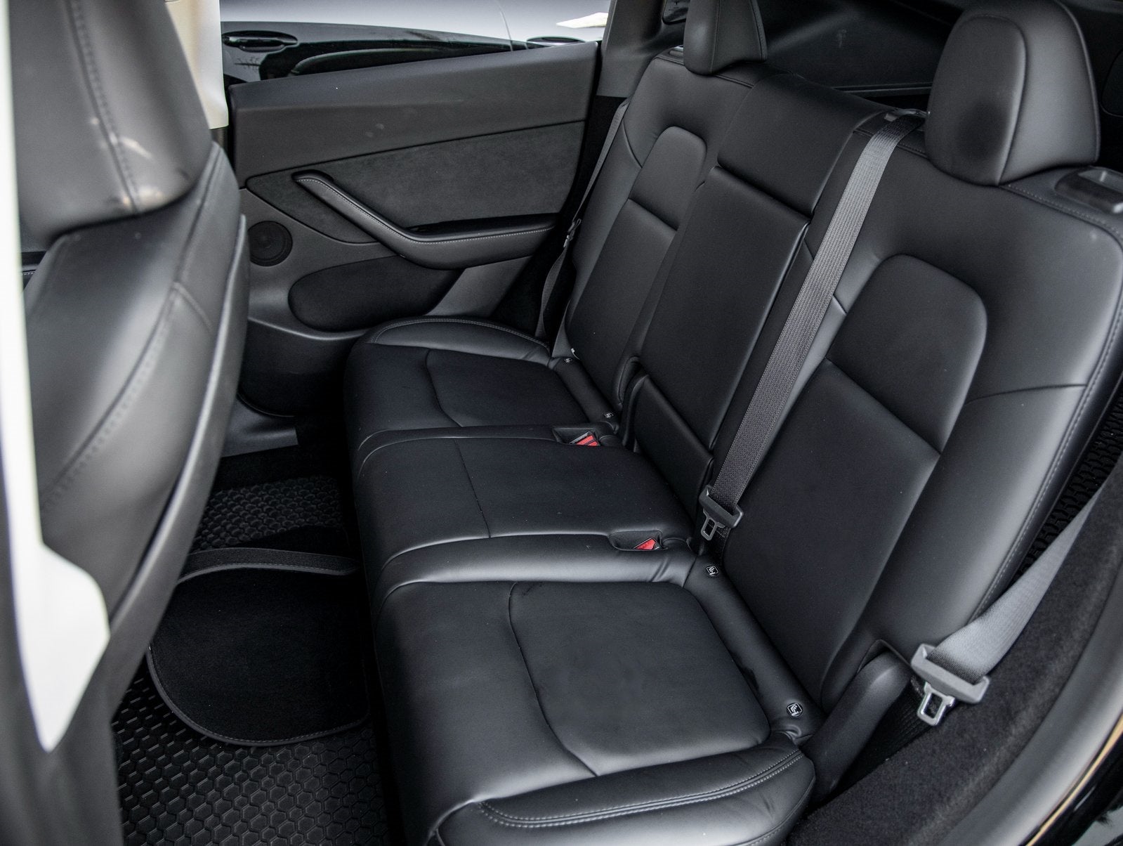 The Model Y Long Range is an all-electric SUV designed for both performance and practicality. Its sleek Black exterior is paired with aerodynamic lines and flush door handles, projecting a modern silhouette that turns heads. Equipped with distinctive 19-inch Gemini wheels and a panoramic all-glass roof, this Tesla merges form with futuristic function.