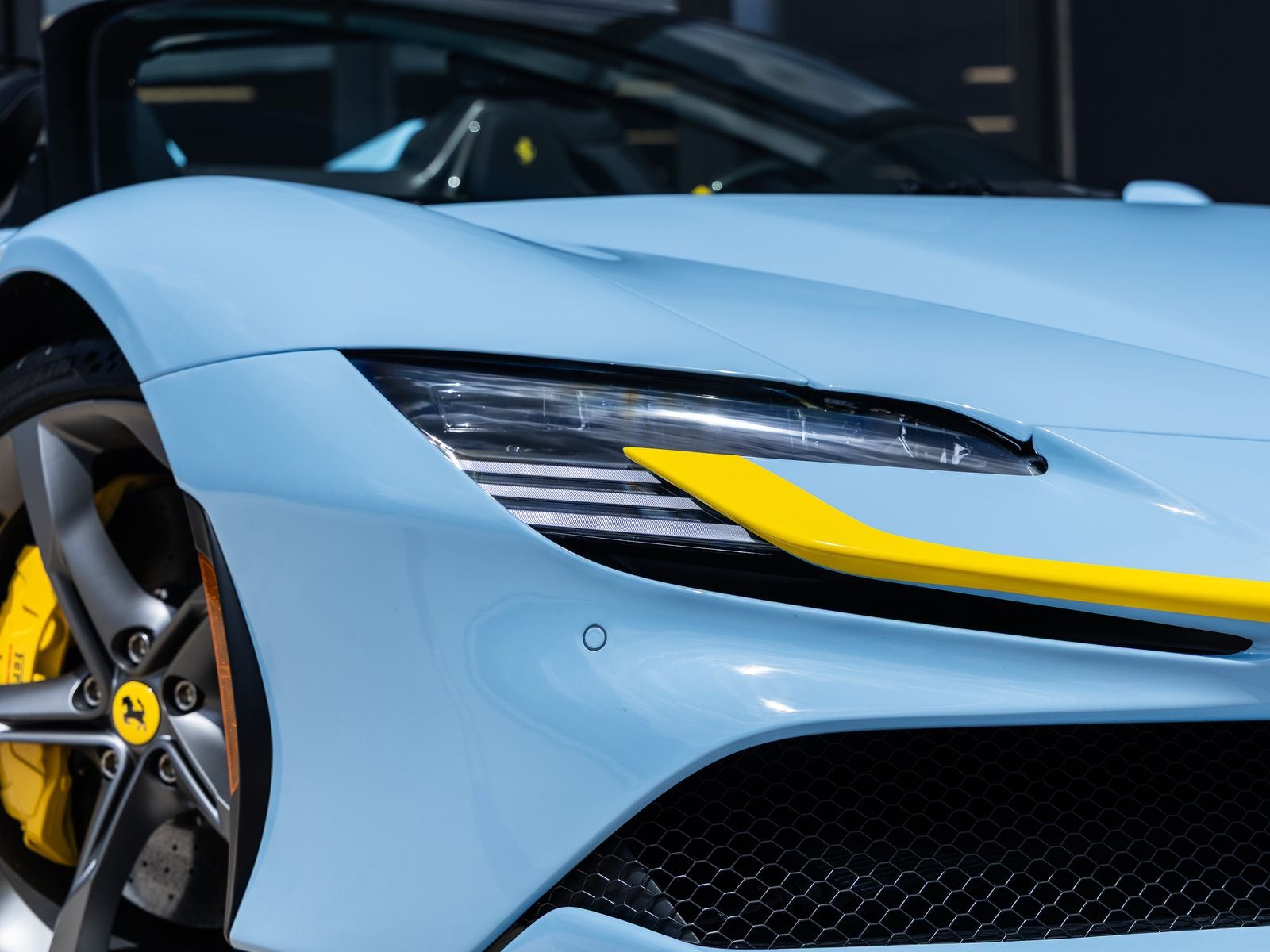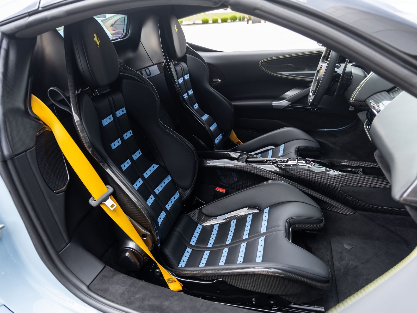 The SF90 Spider stands as a pinnacle of Ferrari innovation, its Azzurro La Plata exteriora rare and bespoke finishaccentuating the cars sculpted, aerodynamic form. Adorned with 20-inch Dark Forged Wheels, Carbon Fiber Exterior Accents including Side Air Splitters and Rear Boot Trim, and iconic Scuderia Ferrari Shields, it presents an unmistakable presence. The Two-Tone Bodywork and Advanced Aerodynamic Enhancements, paired with the Fiorano Package, elevate both its visual drama and track-focused capability.