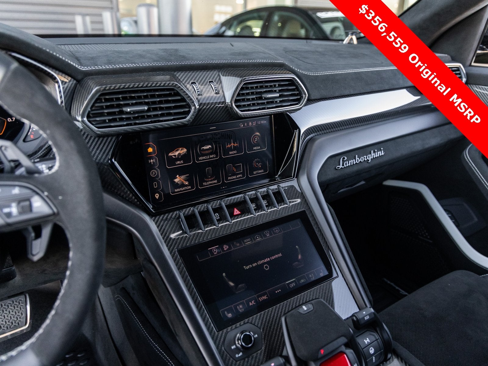 The Urus Performantes Verde Gea Lucido exterior captures attention instantly, amplified by its aggressive styling and meticulous attention to detail. Outfitted with 23 Pelope Diamond Finished Wheels, Black Calipers, and the Extended Performante Trim Pack on Advanced 3D Bang & Olufsen Sound, this SUV embraces both ferocity and refinement. A Carbon Fiber Bonnet in Shiny Finish, Akrapovic Matte Black Exhaust Tailpipes, and Carbon Fiber Air Vents & Instrument Cluster elevate the design with a motorsport-inspired edge.