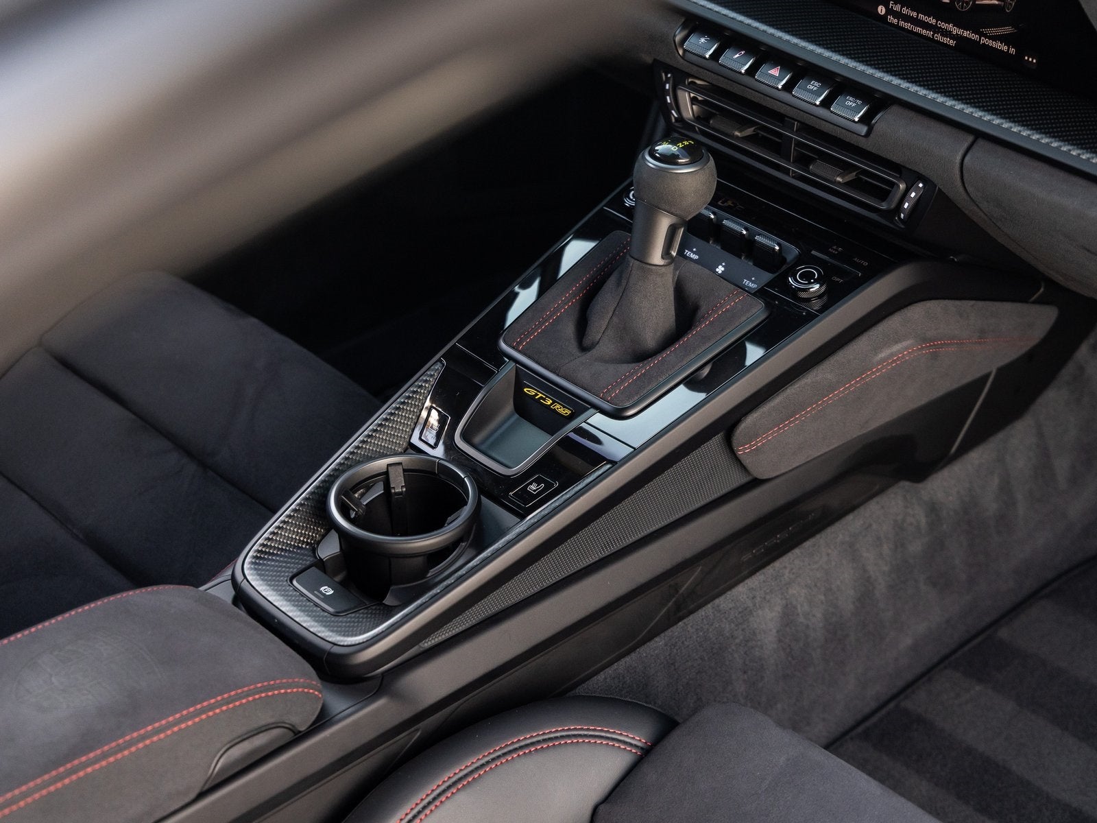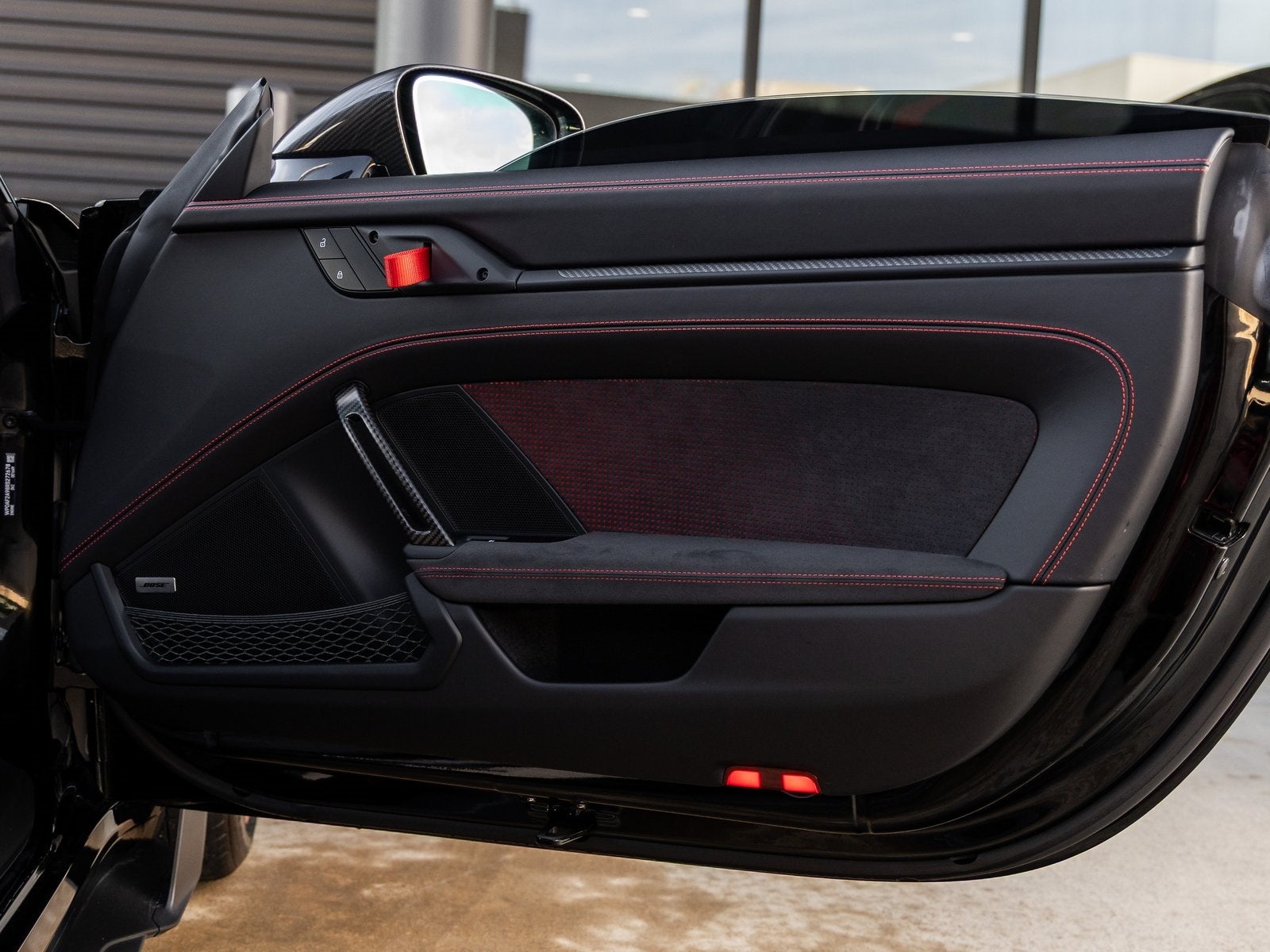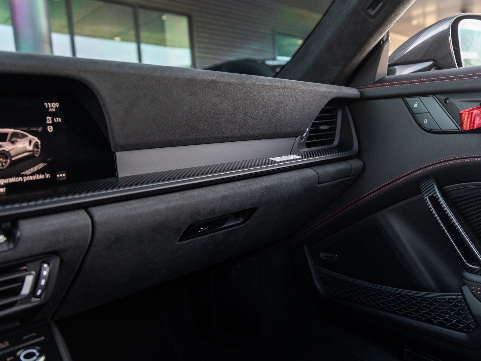 Step inside and you are immersed in a Leather/Race-Tex interior in Black with Guards Red stitching, crafted to keep the driver fully connected to the road or track. Adaptive Sport Seats Plus (18-way) provide exceptional support, while Guards Red accents such as the central tachometer, seat belts, and Chrono stopwatch dial reinforce the motorsport-inspired cockpit. Bespoke illuminated door-sill guards in matte carbon fiber, a Race-Tex center console lid with Porsche Crest, and aluminum pedals and footrest elevate the interior with a purposeful yet luxurious finish.