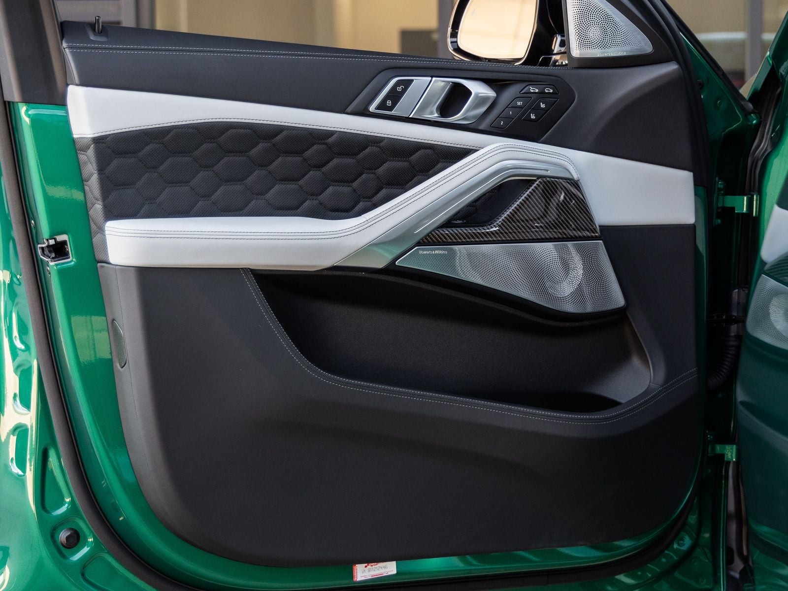The X6 M Competition stands as a bold statement of power and design, its Isle of Man Green Metallic exterior not just a color, but an unmistakable mark of exclusivity. Adorned with 21/22 M Star-Spoke Bi-Color Wheels, M Shadowline Lights, and a striking M Carbon Rear Spoiler, it presents an aggressive and commanding stance. Signature quad exhaust outlets and sculpted body lines further emphasize its performance pedigree.