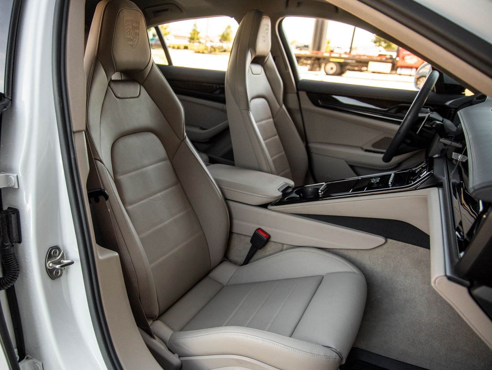 The Panamera stands as a beacon of design and performance, its Carrara White Metallic exterior not just a color, but a badge of honor that reflects Porsche's illustrious heritage. Adorned with 21-inch Panamera SportDesign Wheels painted in High Gloss Black and HD-Matrix Design LED Headlights, it presents an unmistakably commanding stance. High Gloss Black accents including the window trim, rear model designation, and PORSCHE logo enhance its sleek and modern aesthetic, while Exclusive Design Taillights and Sport Tailpipes in Dark Bronze further elevate its dynamic presence.