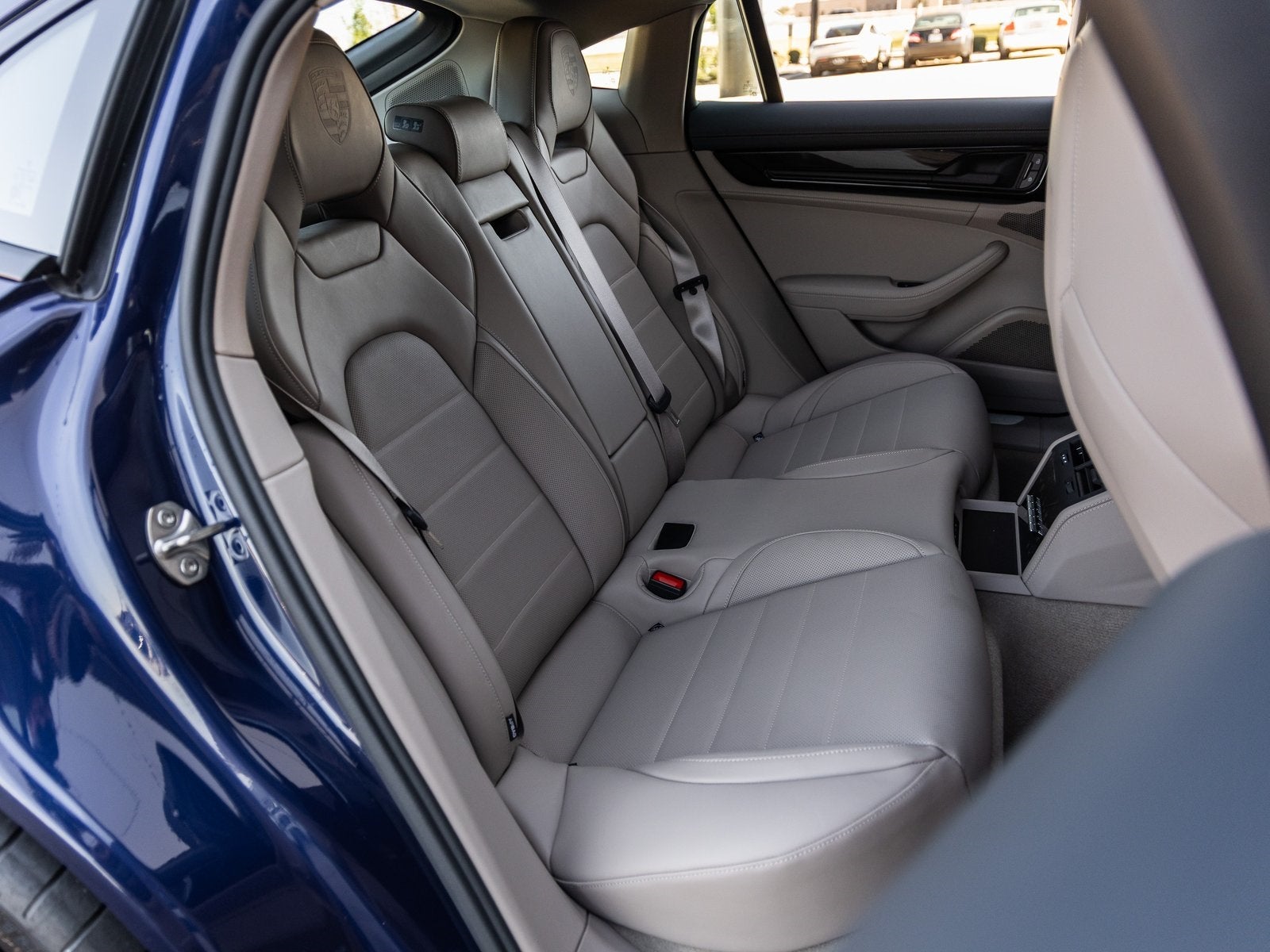 The Panameras sleek exterior in Gentian Blue Metallic is paired with 21 911 Turbo Design Wheels and HD-Matrix Design LED Headlights, giving it a bold and modern presence. Wheel Center Caps with Colored Porsche Crest and High Gloss Black Window Trim complete the refined look, while the Porsche Crest on Headrests adds a signature touch.