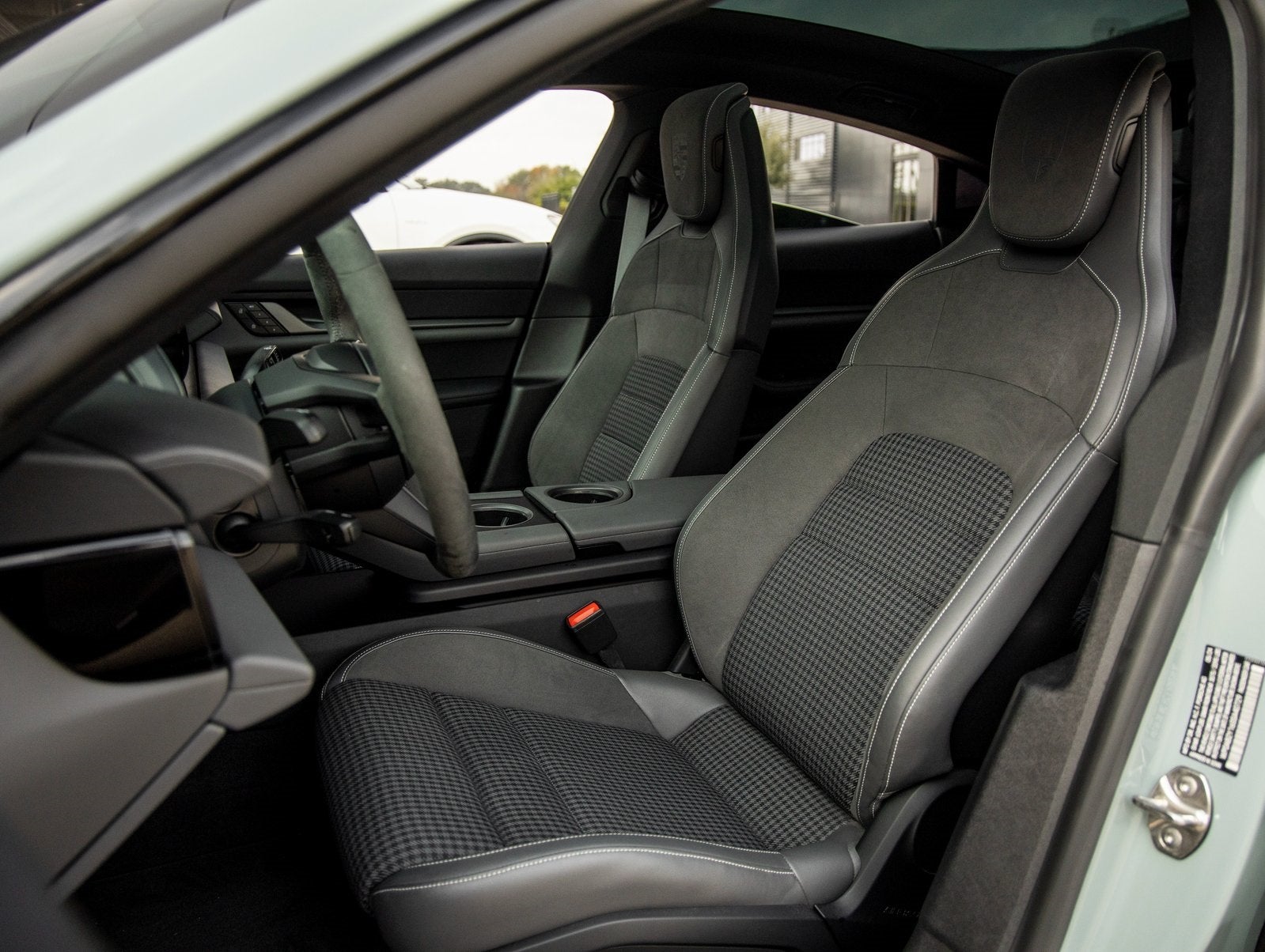 The Taycan 4S stands as a beacon of design and performance, its Shade Green Metallic exterior not just a color, but a badge of honor that reflects Porsches commitment to cutting-edge electric mobility. Adorned with 20 Sport Aero Wheels, Window Trim in High Gloss Black, and Model Designation in High Gloss Black, it offers a modern and sleek aesthetic. The Fixed Panoramic Roof in Glass and Under Door Puddle Light Projectors further accentuate the futuristic styling.