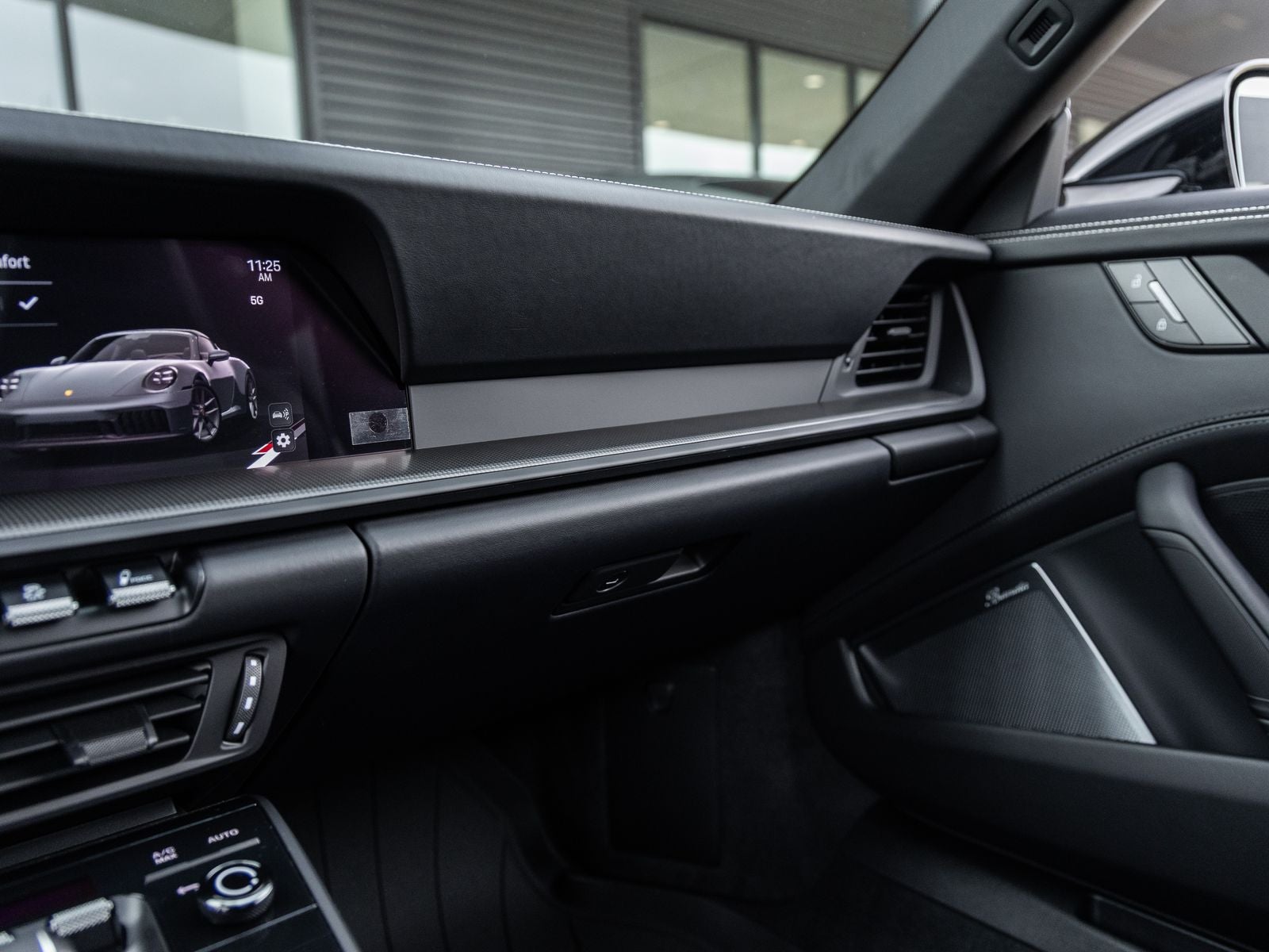 Step inside and the Leather Interior in Black with Chalk Stitching greets you, exuding an air of luxury that only Porsche can deliver. Adaptive Sport Seats Plus (18-way) with Memory Package provide exceptional comfort and support, while Ventilated Front Seats enhance everyday usability. Matte Carbon Fiber Interior Trim Inlays, the Heated GT Sport Steering Wheel with Matte Carbon Fiber accents, and Porsche Crests on the Headrests reinforce the cars motorsport-inspired elegance. Illuminated Matte Carbon Fiber Door-Sill Guards and Aluminum Pedals further elevate the cabins bespoke craftsmanship.