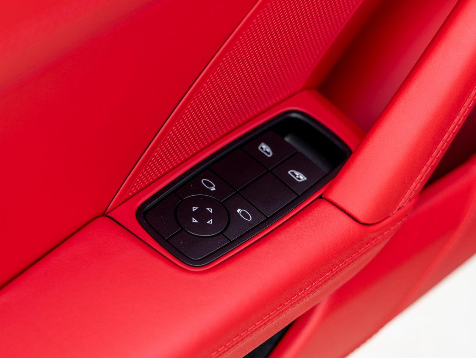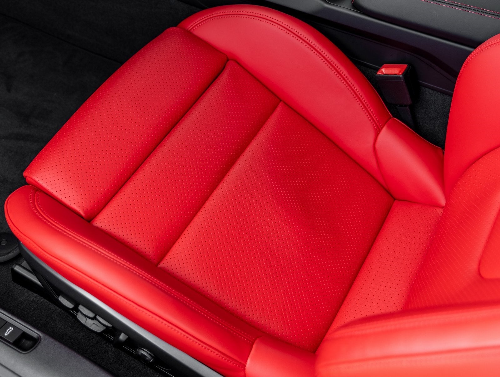 Step inside and you're welcomed by a Two-Tone Exclusive Manufaktur Leather Interior in Black and Guards Reda bespoke environment that merges race-readiness with refined luxury. This GT3 features Adaptive Sport Seats Plus (18-way), Race-Tex roof lining and sun visors, and Sport Seat Backrest Shells in Leather with Painted Inlay. Details such as Seat Belts in Guards Red, Steering Column Casing in Leather, Door-Sill Guards in Black Brushed Aluminum (Illuminated), and Ambient Lighting accentuate the interiors premium yet performance-focused atmosphere.