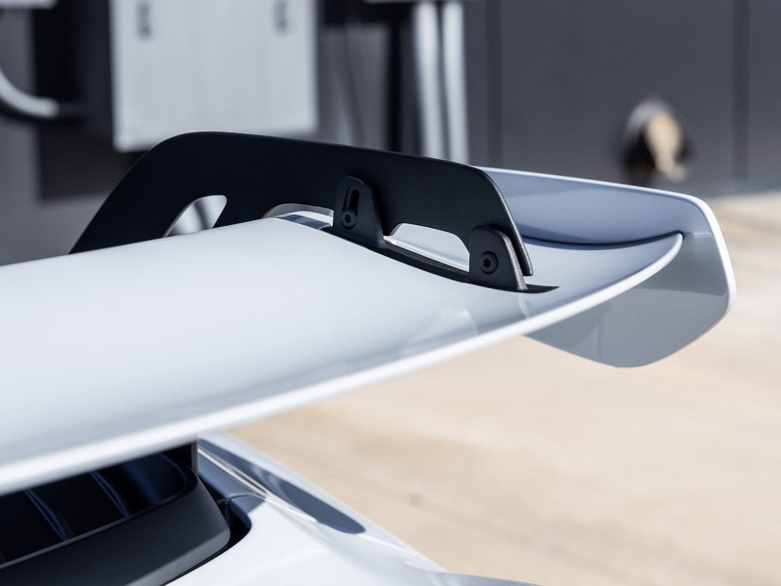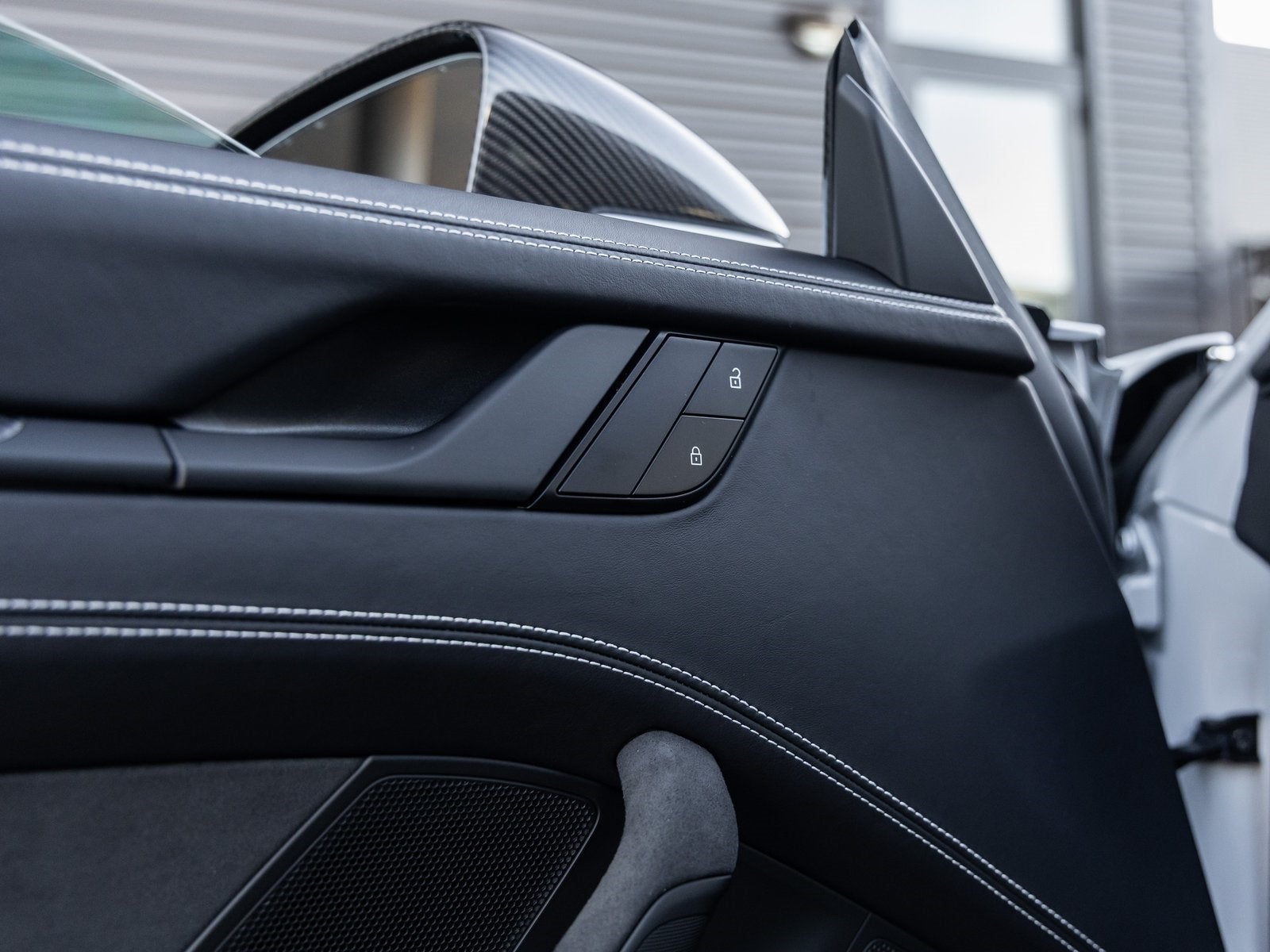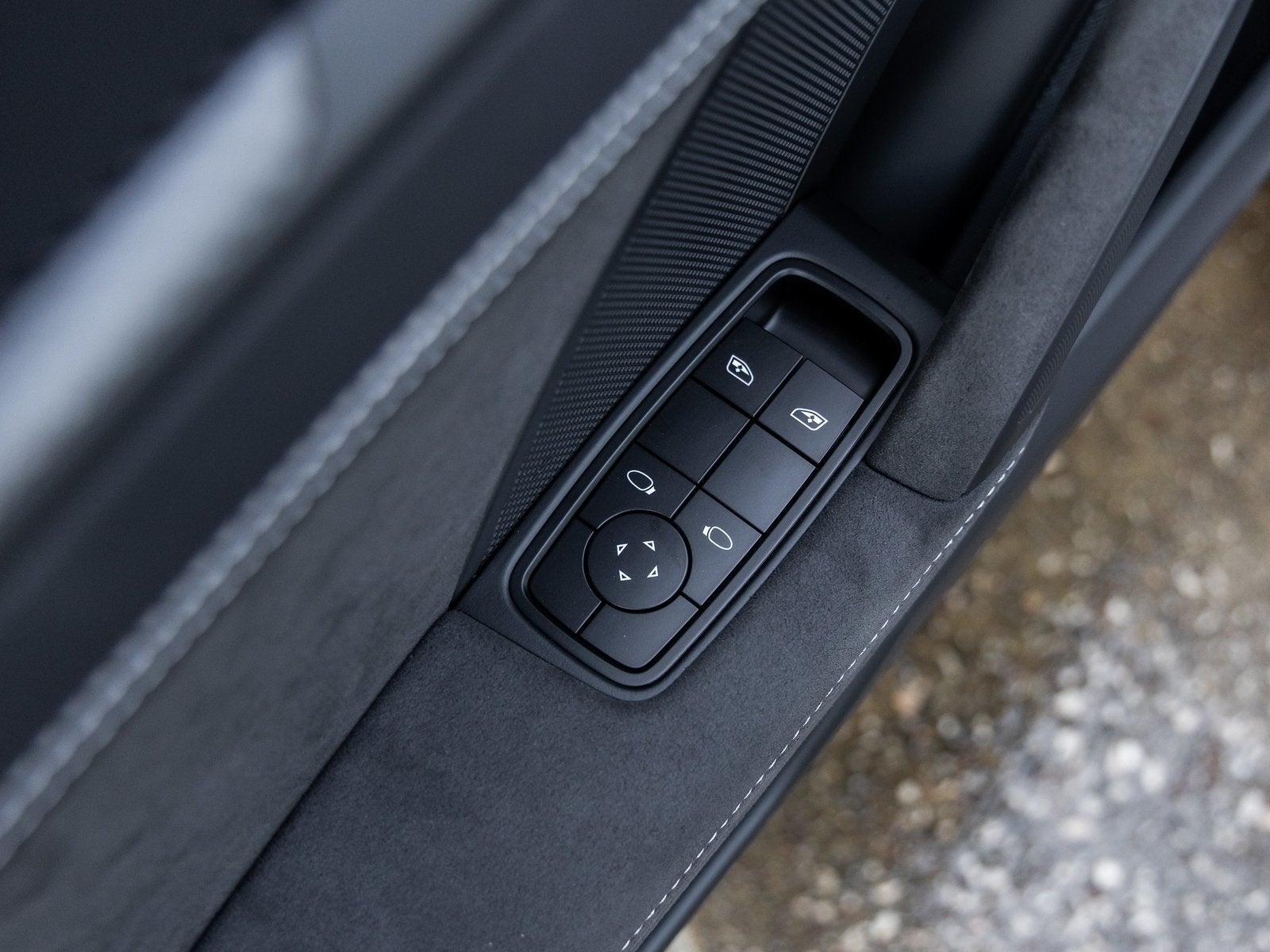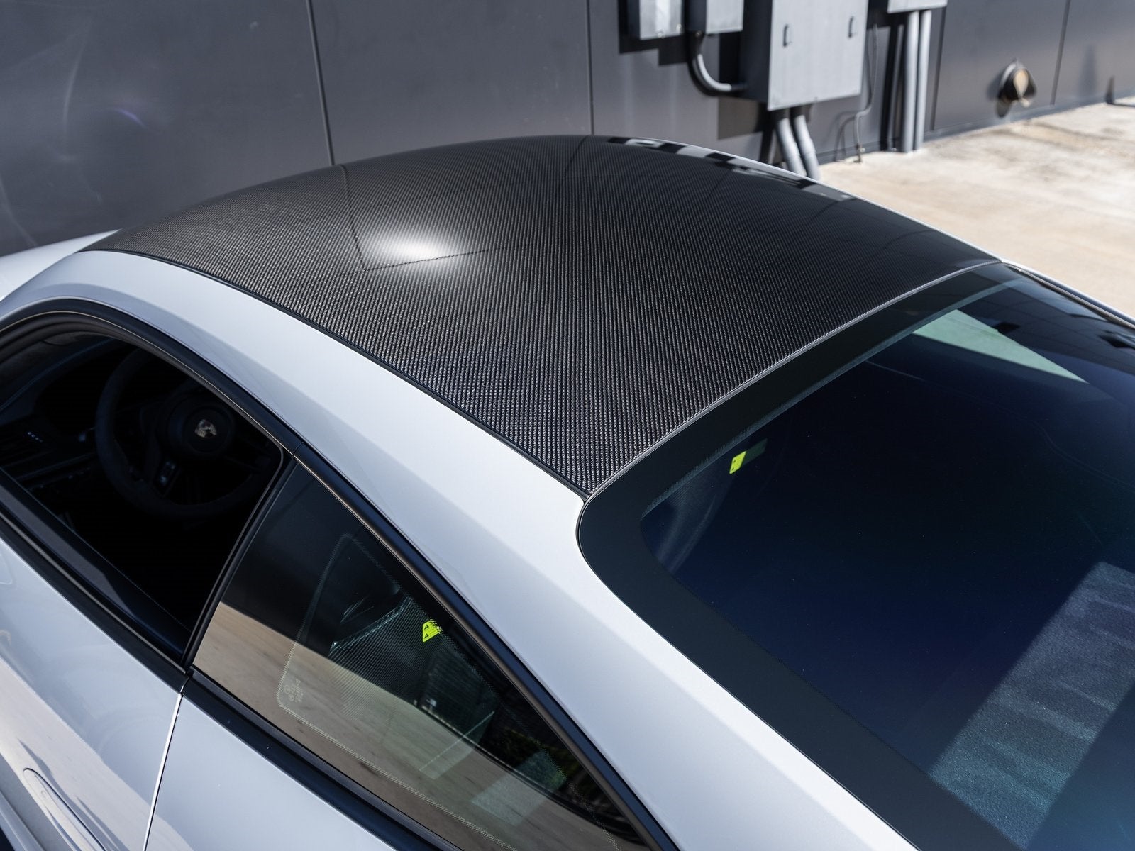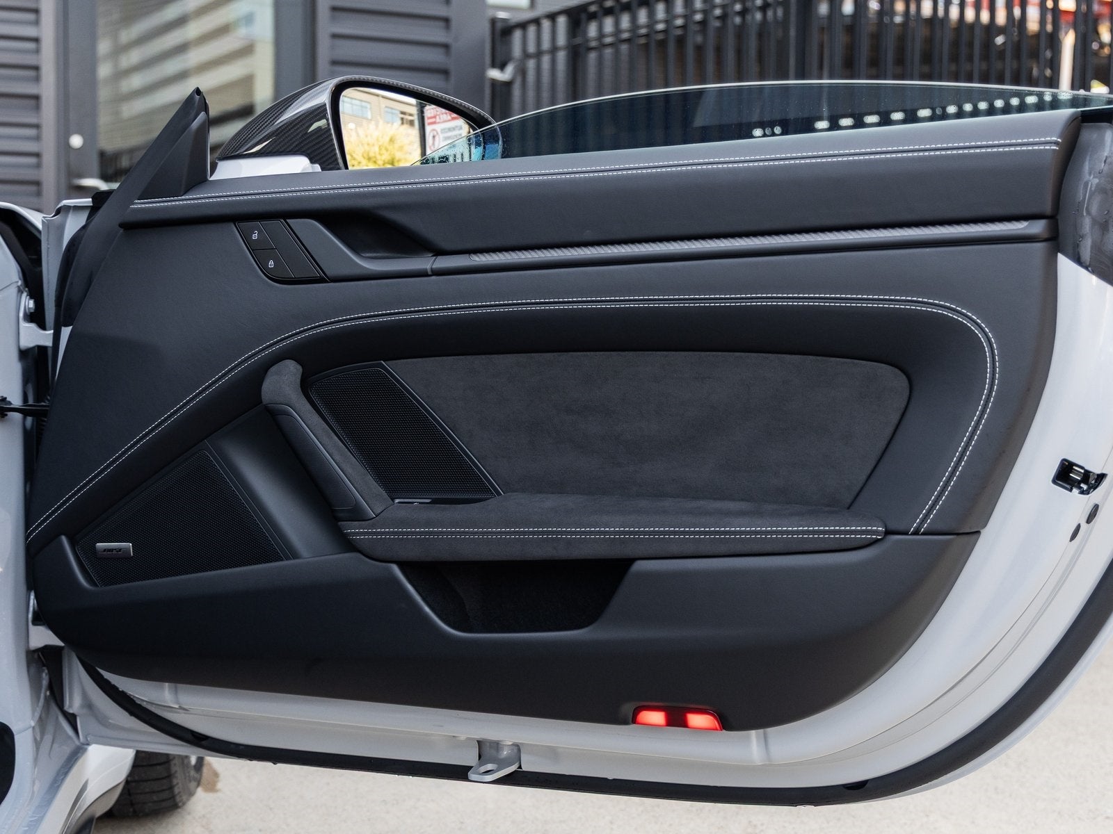 Step inside and the Leather/Race-Tex Interior in Black with GT Silver Stitching greets you, exuding an air of luxury that only Porsche can deliver. Folding Lightweight Bucket Seats, Seat Belt Outlet Trims in Race-Tex, and Sun Visors in Race-Tex punctuate the interior with track-ready flair. Ambient details like Pedals and Footrest in Aluminum, Interior Trim in Black with Matte Carbon Fiber Inlays, and Illuminated Matte Carbon Fiber Door-Sill Guards elevate the cockpit to an art form. The BORN IN FLACHT Under Door Puddle Light Projectors serve as a subtle nod to its racing DNA.